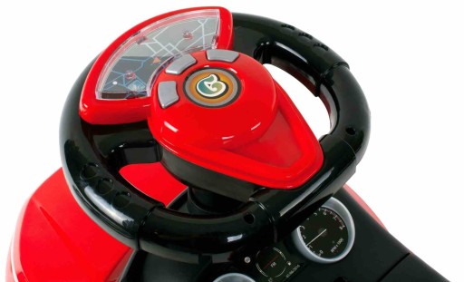 Jeździk jest wyposażony w kierownicę z dźwiękami, co dodaje realizmu zabawie i zachęca dziecko do interakcji z zabawką