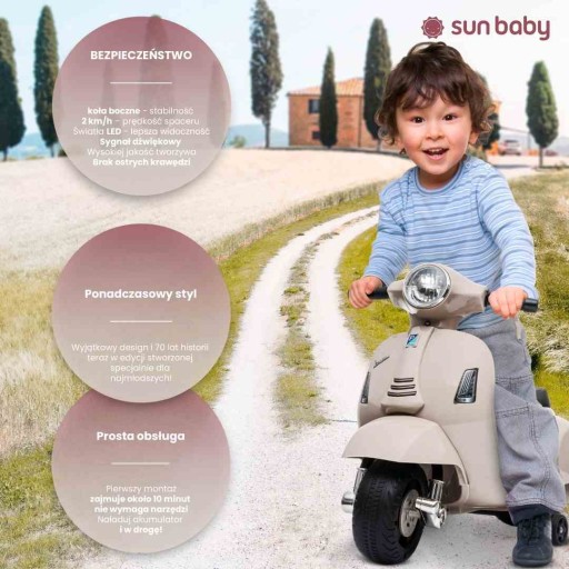 Maksymalna prędkość elektrycznej Vespy to 2 km/h – czyli tempo spokojnego spaceru. Nie musisz się martwić, że dziecko odjedzie w siną dal :-)