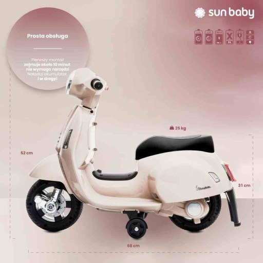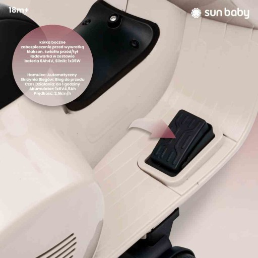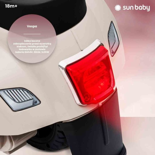Skuter elektryczny dla dziecka Vespa wyposażono w koła boczne, które chronią przed wywróceniem na bok, nie trzeba się martwić o to, czy dziecko poradzi sobie z zachowaniem równowagi.