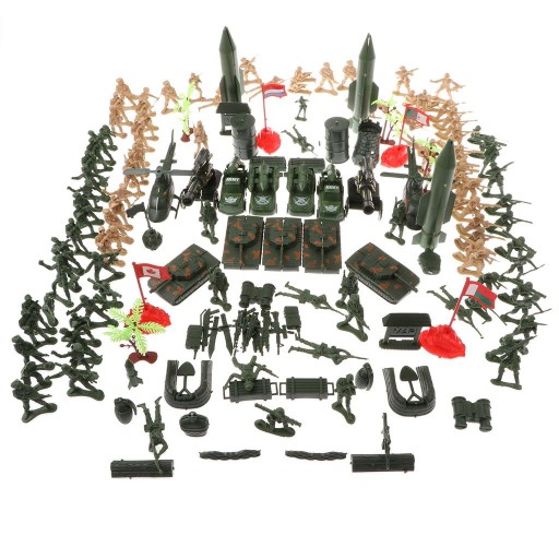 Zawiera ok. 100 sztuk figurek żołnierzy 5 cm (w 2 kolorach), 5 czołgów, 2 helikoptery, 1 stacja wartownicza i inne akcesoria (wyślemy losowo, niektóre małe akcesoria będą inne)