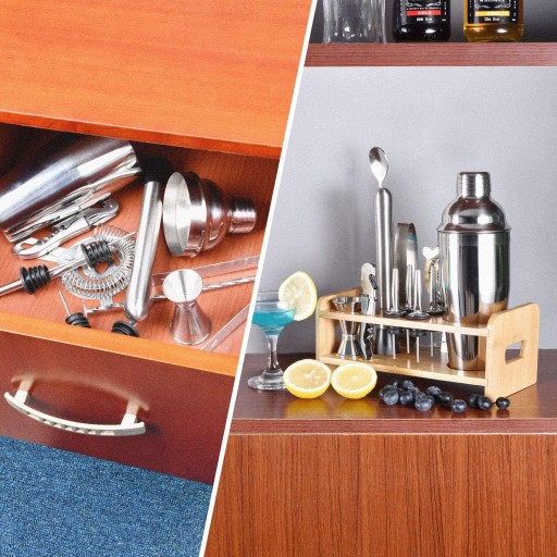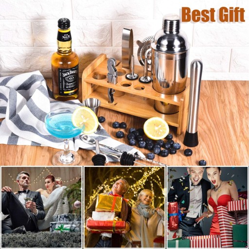 Kompletny Zestaw: Zestaw zawiera 65 ml shaker koktajlowy, 15/30 ml podwójne jigger, sitko, szczypce do lodu, błotnik, łyżkę, nalewki do alkoholu (4 sztuki), otwieracz do wina oraz unikalny stojak bambusowy. Dodatkowo dołączona jest broszura z przepisami na koktajle, abyś mógł eksperymentować z różnymi smakami i kompozycjami.