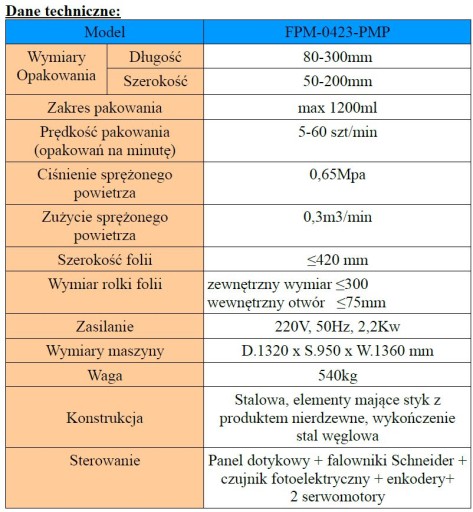 - Prędkość pakowania : 5-60 szt/min (opakowań na minutę)