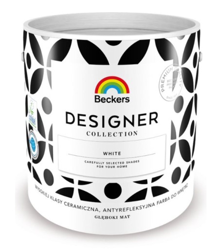 BECKERS DESIGNER COLLECTION WHITE – wysokiej klasy, wodorozcieńczalna, głęboko matowa farba ceramiczna w kolorze białym. Farba przeznaczona jest do dekoracyjno-ochronnego malowania ścian i sufitów wewnątrz pomieszczeń mieszkalnych, biurowych i użyteczności publicznej, w tym w obiektach szkolno-wychowawczych i służby zdrowia (szkoły, przedszkola, żłobki, szpitale, przychodnie, gabinety, sale operacyjne, pomieszczenia zabiegowe, laboratoria, stacje dializ, itd.). Można stosować do malowania płyt kartonowo-gipsowych, tynków gipsowych, cementowo-wapiennych, dekoracyjnego malowania podłoży betonowych, jak również do renowacji starych wymalowań.