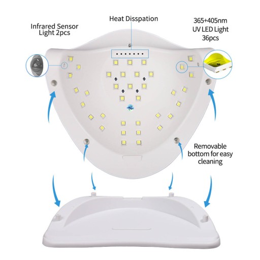 Profesjonalna lampa UV / LED 54W, 45 DIOD która szybko i równomiernie utwardza wszystkie żele, lakiery hybrydowe i inne preparaty światłoutwardzalne. Możliwość ustawienia mocy, dno mocowane na magnes.