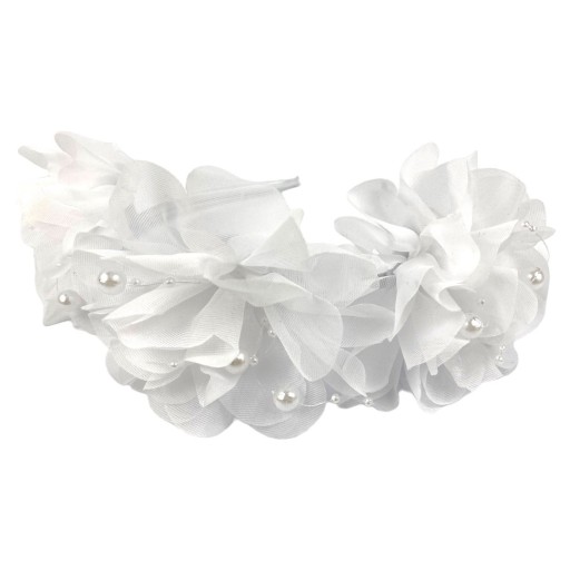 Klasyczny wianek wykonany z bielutkiego szyfonu oraz delikatnie zdobiony. Do jego wykonania zostały użyte najwyższej jakości dodatki. Piękne białe szyfonowe kwiatuszki oraz perełki. Całość przepięknie sie prezentuje.