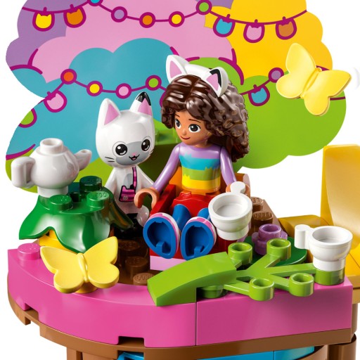 • Kultowe postacie — zestaw zawiera minifigurkę Gabi oraz figurki Kiciusia Pandusia i Wróżkici, a także domek na drzewie do zbudowania z łóżkiem i przekąskami oraz ogród ze zjeżdżalnią, huśtawką i karuzelą.