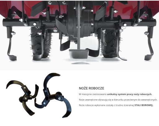 W maszynie zastosowano unikalny system pracy noży roboczych. Polega on na przeciwbieżnym kierunku obrotów noży zewnętrznych, w stosunku do wewnętrznych. Uzyskujemy dzięki temu lepsze spulchnienie i przemieszanie warstwy ornej gleby, przy mniejszych silach działających na kola napędowe i rękojeści.