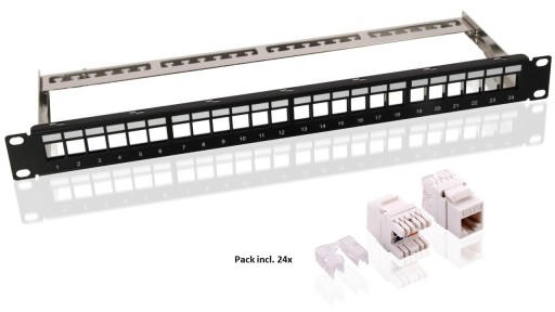 w tym 24x moduły CAT 6 (UTP) Z systemem Keystone nie ma żadnych ograniczeń co do instalacji. Moduły Keystone mają uniwersalne zastosowanie, są wymienne i indywidualnie konfigurowalne. Wyposażony w różną liczbę portów, wszystkie wymagane kable LAN mogą być wygodnie podłączone do patch panelu.