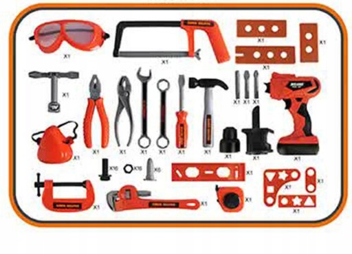 Wiertarka na Baterie: Ergonomicznie zaprojektowana, aby idealnie pasować do małych rączek. Naśladuje prawdziwą wiertarkę, dodając realizmu zabawie. Zestaw Narzędzi: Miarka, piłka do drewna, obcęgi, klucze - wszystko, co potrzebne do małych napraw. Akcesoria BHP: Okulary ochronne i maseczka uczą zasad bezpieczeństwa podczas pracy. Bezpieczne i Edukacyjne Zabawki dla Twojego Dziecka