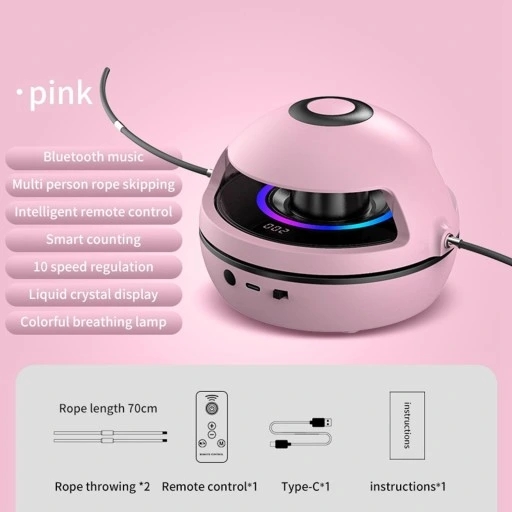 Cecha: Ta skakanka jest również wyposażona w duży wyświetlacz LED, dokładny inteligentny układ liczący do monitorowania postępów ćwiczeń, prędkość obrotową 70-160, 7 kolorowych lamp oddechowych, funkcję muzyki, możesz słuchać muzyki podczas ćwiczeń, uprzyjemniać sport . Dolna konstrukcja nośna, stabilna i nie odwrócona.