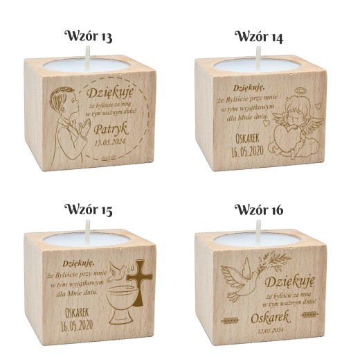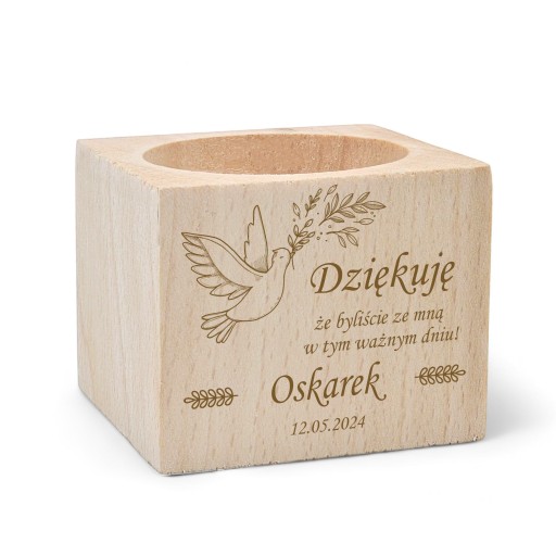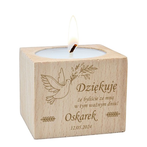 Produkt, którym jest podziękowanie na komunię w postaci drewnianego świecznika, to wyjątkowy i piękny prezent, który dodaje uroku i symbolicznego znaczenia temu ważnemu wydarzeniu. Ten piękny świecznik z grawerem jest idealnym rozwiązaniem jako podziękowanie wszystkim gościom, którzy wzięli udział w ceremonii komunii.