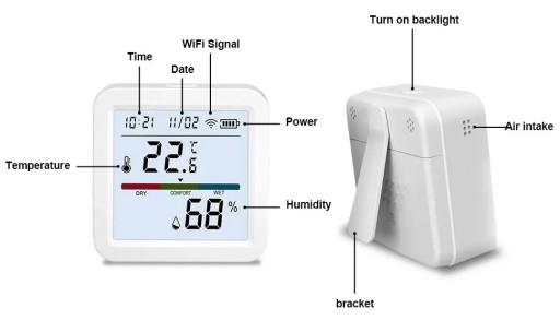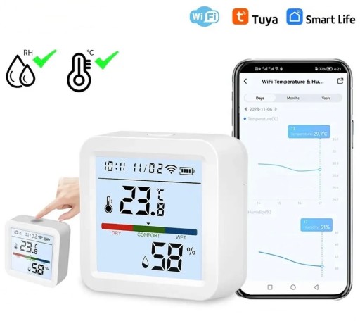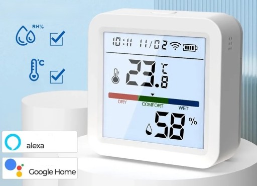 - Czujnik temperatury i wilgotności : mierzy zarówno poziom temperatury jak i wilgotności w domu dla optymalnego komfortu