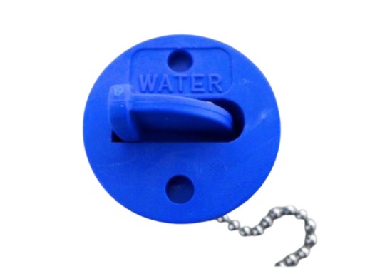 Korek wlewu wody PCV z napisem WATER, posiada łańcuszek zabezpieczający przed zgubieniem.