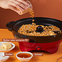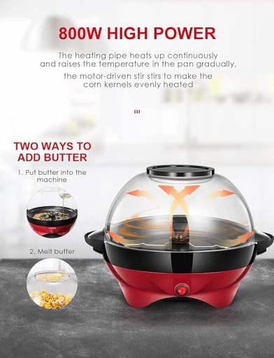 - Multi-aromatyzowany popcorn Wszystkie rodzaje przypraw można dodawać na blasze do pieczenia, takie jak masło, cukier, sól itd., można również dodać masło na wierzchu przezroczystej pokrywy, masło przepływa do maszyny przez otwory wentylacyjne i równomiernie rozprowadza się na popcornie. Pyszny i bogaty popcorn jest dziecinnie prosty.