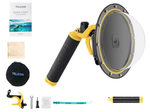 Producent Telesin Nazwa GoPro Hero 9 / Hero 10 / Hero 11 / Hero 12 Dome Port Waga 420g Wymiary 185 x185 x 102mm Materiał stal nierdzewna + PC Kompatybilność GoPro Hero 9 / Hero 10 / Hero 11 / Hero 12 Kolor czarno-żółty
