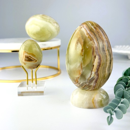 ✅ Jajko wykonane z onyksu pakistańskiego zachwyca wstęgowym wybarwieniem i pięknymi kolorami w palecie od zielonego, przez kremowy, aż do brunatnego.