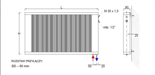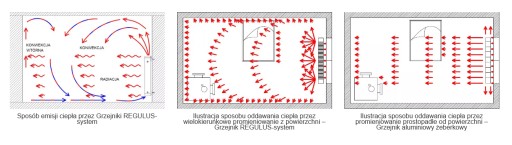 - powietrze zasysane od dołu przez liczne kominy konwekcyjne grzejnika, przepływając przez jego wnętrze, po zetknięciu z powierzchnią rur i lamelek ogrzewa się, po czym wypływa górą poprzez perforowaną obudowę górną. Ten podwójny sposób emisji ciepła powoduje równomierne ogrzanie powietrza w całym pomieszczeniu