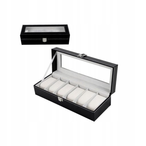 Eleganckie pudełko na zegarki posiada aż 6 przegródek, w których można umieścić nie tylko zegarki, ale również inną biżuterię. Kasetka ma elegancki, czarny kolor i widoczne jaśniejsze szwy, co dodaje całości elegancji i stylu. Wieczko etui na zegarki jest przezroczyste (szyba akrylowa), dzięki czemu pudełko na zegarki możemy wykorzystać nie tylko do przechowywania, ale również do eleganckiego eksponowania zawartości.