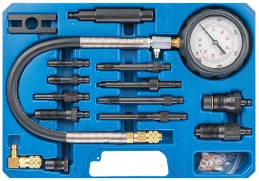 Tester przeznaczony do pomiaru stopnia sprężania w cylindrach silników wysokoprężnych z wtryskiem bezpośrednim i pośrednim. Miernik ciśnienia z podwójną podziałką Bar i PSI wyposażony w zawór kontrolny do celów kontrolnych.