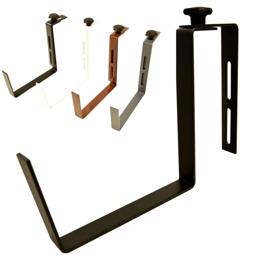 Metalowy uchwyt na skrzynkę balkonową malowany proszkowo na kolor czarny, biały, brązowy lub szary. Wieszak można regulować na odpowiednią szerokość barierki od 3-13 cm.