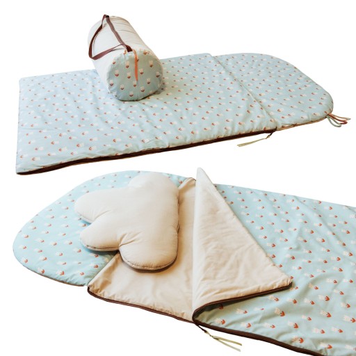 Aby ułatwić dziecku użytkowanie zamek został wszyty po obu stronach śpiwora. Do suwaka dołączona została urocza tasiemka , aby malutkie rączki mogły go wygodnie zamykać i otwierać:) W zestawie znajduje się podusia w kształcie chmurki :) , a całość zapakowana jest w wygodny i poręczny pokrowiec, pasujący do zestawu.