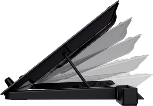 Stojak chłodzący do laptopa o wysokiej jakości wzornictwie z wytrzymałą perforowaną metalową górną częścią Zwiększa wydajność laptopa i poprawia wysokość i kąt widzenia 5 podświetlanych na niebiesko wentylatorów 1 x 130 mm 4 x 50 mm Pasuje do wszystkich laptopów do 173 cala. Kąt regulowany w 5 krokach do wysokości maks. 190 mm Ze zdejmowaną podstawką na smartfon dzięki czemu możesz odłożyć smartfon w zasięgu wzroku