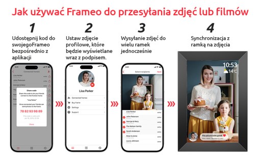 Pobierając aplikację Frameo z Google Play lub App Store, możesz szybko podzielić się wspaniałymi chwilami z powodui. Cyfrowa ramka na zdjęcia obsługiwane w formacie obrazu JPG/JPEG/BMP/PNG i żywe filmy (maks. 15 sekund).