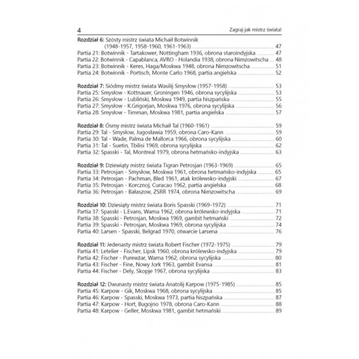 Niezwykle istotne jest zapoznanie się z dorobkiem twórczym mistrzów świata. Czego można się nauczyć od nich? Z całą pewnością bardzo wiele. Każdy z nich był bowiem najwybitniejszym graczem swoich czasów i na drodze do tytułu najsilniejszego zawodnika globu musiał pokonać elitę najlepszych z najlepszych oponentów w rozgrywkach eliminacyjnych i w końcu zwyciężyć w meczu finałowym! W tych trudnych i emocjonujących spotkaniach musiał wykorzystać wszystkie swoje umiejętności oraz wiedzę, aby rozłożyć na łopatki wielu znakomitych przeciwników!
