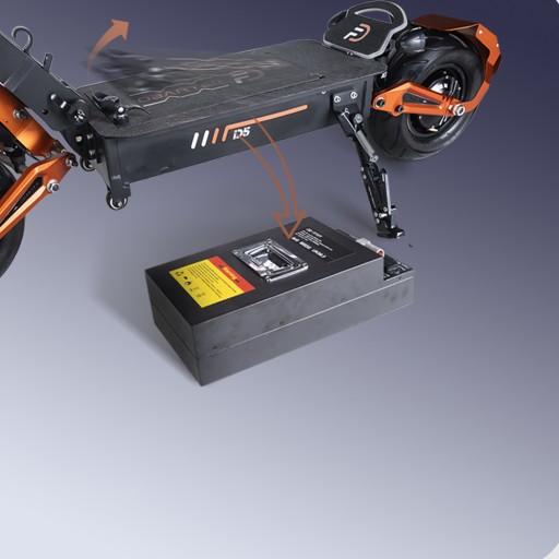Hulajnoga elektryczna D5 ma akumulator 1680 Wh, zasięg może być 60-120 km, można ją na akumulator w ciągu 5-7 godzin, wyjmowany akumulator można wyjąć osobno w celu ładowania (pełne naładowanie około 54,6 V).