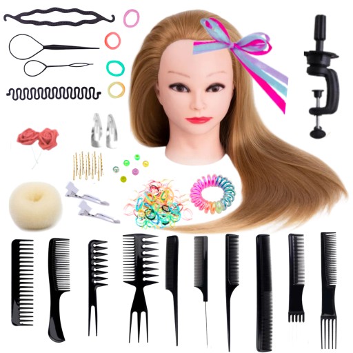Zestaw zawierający głowę fryzjerską z włosiem syntetycznym w kolorze blondu oraz wiele przydatnych akcesoriów do nauki. Główka jest idealna do nauki dla osób początkujących jak i tych, które chcą trenować i ulepszać swoje umiejętności. Włosy z miękkim i gładkim włóknem, są doskonałe do tworzenia ulubionych upięć, a akcesoria pozwolą na piękne przyozdobienie fryzury! Każda główka posiada w zestawie uchwyt dzięki, któremu z łatwością zamocujesz ją do blatu pod odpowiednim kątem.