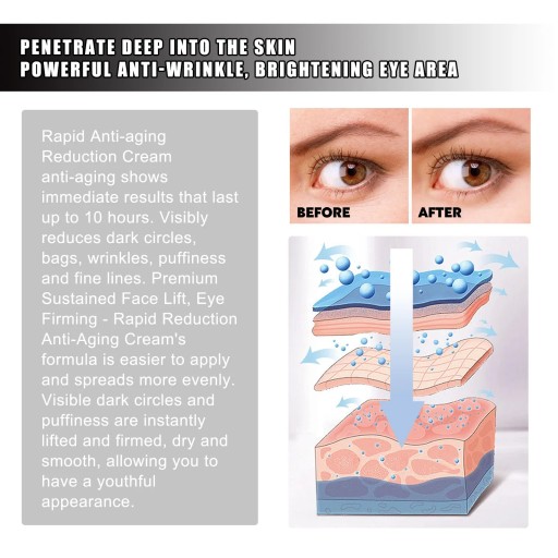 ▶Rapid Anti-aging Reduction Creamanti-aging shows immediate results that last up to 10 hours. Visibly reduces dark circles, bags, wrinkles, puffiness and fine lines. Premium Sustained Face Lift, Eye Firming-Rapid ReductIon Anti-Aging Cream's formula is easrer evenly. And spreads more evenly. Visible dark circles and puffiness are instantly lifted and firmed, dry and smooth, allowing you to have a youthful appearance.