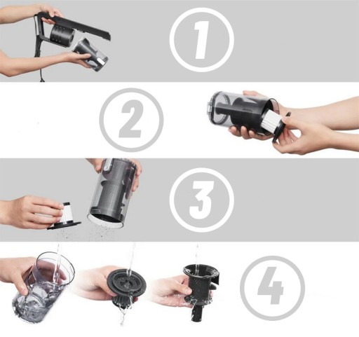 - Wypłucz wodą pojemnik na zanieczyszczenia, filtr HEPA i plastikowy filtr perforowany.