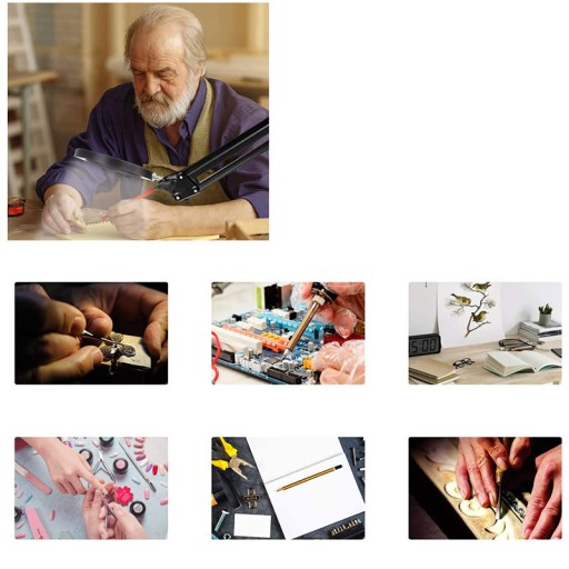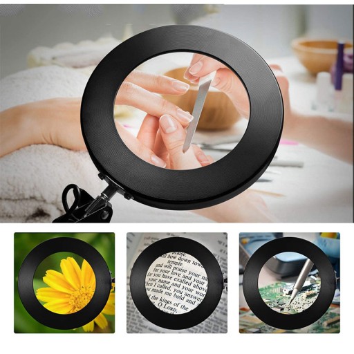 Szklana soczewka może być regulowana w górę i w dół o 270 ° i obracana o 360 °. Teleskopowe długie ramię zapewnia większą elastyczność. Ramię może być przedłużone do 50 cm, z 3 pokrętłami i 4 sprężynami. Regulując pokrętła, można utrzymać światło LED w żądanej pozycji bez łatwego przesuwania, uwalniając w ten sposób obie ręce. Metalowy klips może mocno przymocować lampę lupę, aby zapobiec jej przewróceniu. Nadaje się do biurek, stołów warsztatowych, półek, stołów itp.