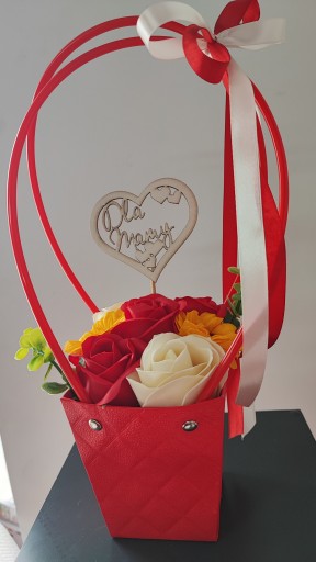 Ozdobne pudełko w kształcie koszyczka w kolorze czerwonym pikowane i wypełnione 7 kwiatami z mydła to znakomity prezent dla każdej kobiety ...który sprawi obdarowanej osobie mnóstwo pachnącej radości...