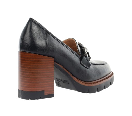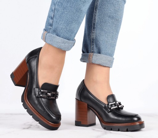 Czarne mokasyny na drewnianym słupku i platformie półbuty VINCEZA