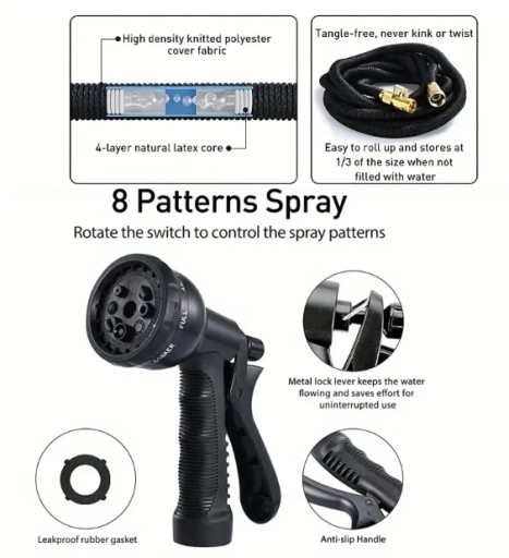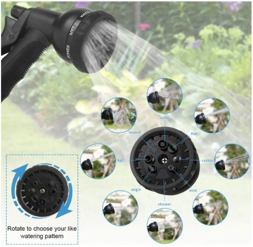 ✅ Wąż ogrodowy zapewnia aż 8 różnych trybów zraszania, umożliwiających łatwe nawodnienie roślin, dokładne umycie samochodu lub delikatne kąpiele naszego pupila.
