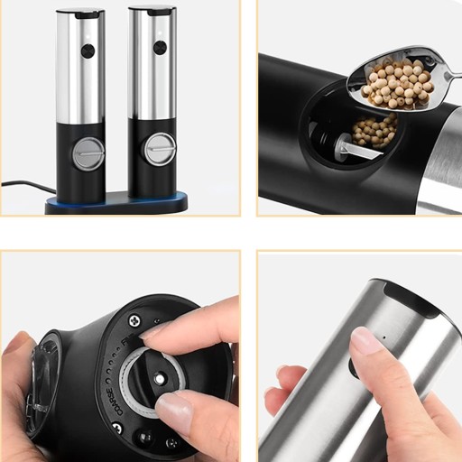 - -Można naładować 2 młynki do pieprzu za pomocą kabla USB typu c, pełne naładowanie trwa 2,5 godziny i po krótkim czasie zmielić 200-300 razy. Wyposażony w bazę ładującą ułatwiającą przechowywanie. Przednia lampka kontrolna świeci się zawsze podczas ładowania, a pełne światło jest wyłączone.