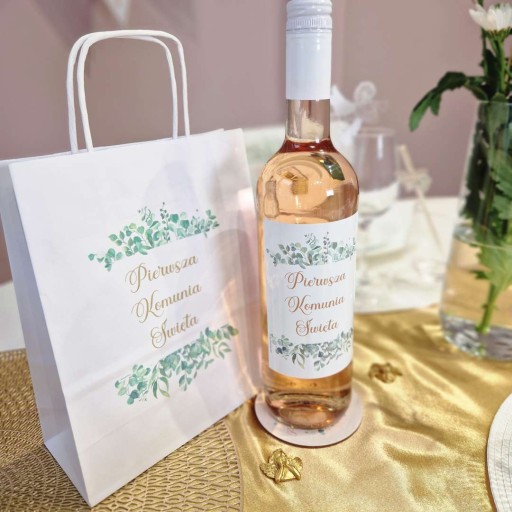 Komunijne NAKLEJKI na butelki etykiety Pierwsza Komunia eukaliptus 5 szt