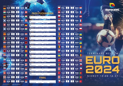 Tradycyjnie drukarnia Eurocent przygotowała dla sympatyków piłki nożnej wyjątkowe terminarze z kompletem spotkań, terminami oraz rozpiską fazy pucharowej. Nasze terminarze dają szansę na uzupełnianie wyników oraz własne typowanie. Dodatkową atrakcją jest fakt indywidualnej personalizacji terminarzy z logo firmy, klubu czy szkółki piłkarskiej.