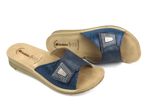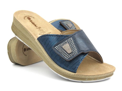 Klapki damskie marki Inblu zostały wykonane z zewnątrz ze skóry ekologicznej w uniwersalnym kolorze granatu.