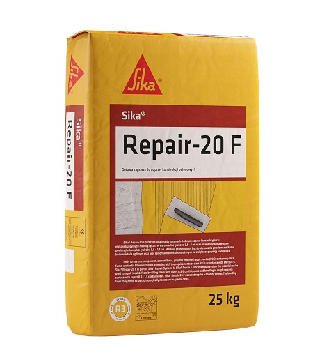 Sika® Repair-20 F jest gotową, jednoskładnikową zaprawą polimerowo-cementową (PCC), zawierającą mikrokrzemionkę, zbrojoną włóknami syntetycznymi. Sika® Repair-20 F w systemie Sika® Repair F jest zaprawą naprawczą i wyrównawczą do wypełniania ubytków betonu z zastosowaniem lub bez warstwy sczepnej Sika® Repair-10 F. Zaprawę można nanosić metodą ręczną lub metodą natrysku na mokro. Sika® Repair-20 F spełnia wymagania dla zaprawy naprawczej klasy R3 zgodnie z PN-EN 1504-3.