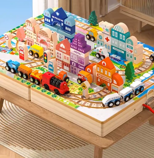 Niesamowity zestaw z torami, pociągami, podkładką w formie drewanianej walizki elementami infrastruktury drogowej oraz klockami do budowania budynków.