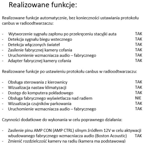 (konieczność ustawienia protokołu Canbus w opcjach Twojego radia, by uzyskać wszystkie funkcje). Bez ustawienia protokołu Canbus w Twoim radiu będą działać funkcje podstawowe, w tym najważniejsza, uruchomienie radia.