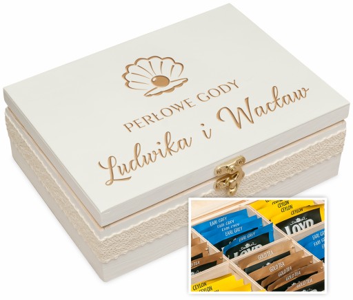 Pudełko wykonane z drewna, dodatkowo na wieczku oryginalny grawer z okazji Jubileuszu oraz życzenia w środku. Herbaciarka zdobiona dekoracyjną koronką (dobieramy losowo), zamykana eleganckim zapięciem w stylu retro. W środku zestaw pysznych herbat marki LOYD.