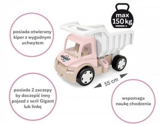 - solidna i trwała konstrukcja, ogromna wytrzymałość (nośność do 150 kg)gigantyczna wywrotka o dł. 55 cm, posiada otwierany kiper z wygodnym uchwytem2 zaczepy – z przodu i z tyłu (można doczepić inny pojazd lub przyczepę z serii Gigant oraz linkę do ciągnięcia)może służyć jako pojazd do przewożenia różnych przedmiotów czy zabawek