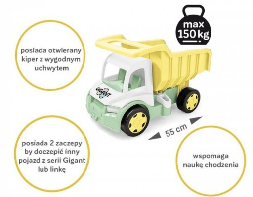 - zabawa z wykorzystaniem Gigant Truck Wywrotka pobudza wyobraźnię dziecka, wspiera rozwój jego umiejętności manualnych i koordynacji ruchowej