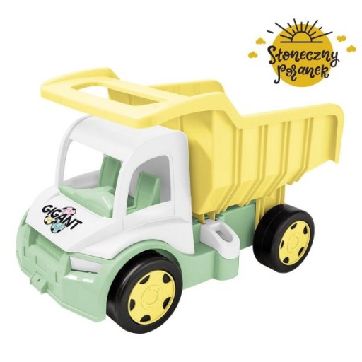 Nowa seria Toys in Trends to niecodzienna oferta zabawek w oryginalnych wersjach kolorystycznych dostosowanych do najnowszych obowiązujących trendów aranżacji wnętrz. Stworzyliśmy cztery niepowtarzalne kolekcje zabawek dopasowane kolorystycznie do czterech magicznych pokojów dziecięcych o bajecznych nazwach: Różana Wata Cukrowa, Słoneczny Poranek, Szmaragdowa Komnata oraz Biszkoptowa Chmurka. Słoneczny Poranek to połączenie pastelowych odcieni słonecznej żółci, szarości, bieli i delikatnego seledynu, z którymi doskonale komponują się nasze zabawki: Gigant wywrotka, Kid Cars trio, Misiowa Piramidka, Kręgle, Serwis kawowy oraz Zamek zestaw do piasku. Gigant Wywrotka w kolorze biało-żółto-seledynowym to fantastyczny, duży samochód o długości 55 cm. Pojazd posiada zaczep z przodu (możliwość zamontowania sznurka, linki do ciągnięcia) i z tyłu. Ogromna wytrzymałość (nośność do 150 kg) gwarantuje wspaniałą zabawę. Solidna i trwała, wielofunkcyjna konstrukcja rozpali serca wszystkich małych wielbicieli pojazdów ciężarowych i będzie im służyć latami. Wywrotka posiada otwierany kiper z wygodnym uchwytem, na którym dziecko może przewozić, co tylko zechce. Dzieciaki pokochają możliwość ładowania, rozładowywania i przewożenia ulubionych zabawek, a także zwariowanej jazdy w domu i ogrodzie. Zabawa Wywrotką Gigant Truck pobudzi wyobraźnię najmłodszych, wspiera umiejętności manualne i koordynację ruchową dziecka. Zabawka wykonana jest z najwyższej jakości materiałów bezpiecznych dla dzieci. Nadaje się do zabawy zarówno w domu, jak i na świeżym powietrzu.