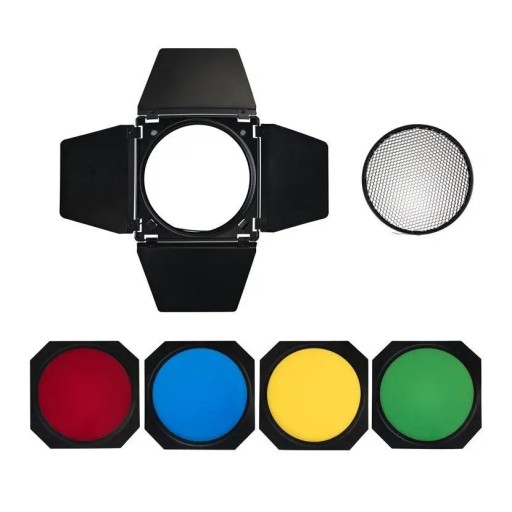 BD-04Godox BD-04 to zestaw z wrotami, gridem o strukturze plastra miodu i 4 filtrami kolorowymi do standardowych czasz lamp błyskowych i światła ciągłego LED.