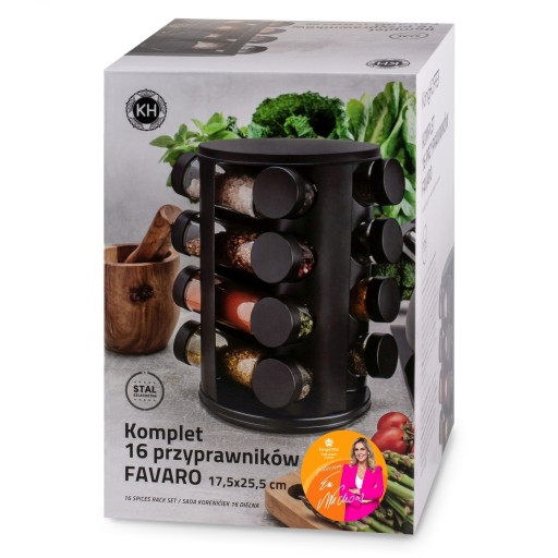 Komplet przyprawników Konighoffer Favaro 16 elementów łączy w sobie elegancję, trwałość i funkcjonalność. Szklane pojemniczki mają tu czarne zakrętki i nakładki z tworzywa sztucznego z otworami pozwalającymi na sprawne i dokładne doprawianie jedzenia. Obrotowy stojak jest nierdzewny i malowany proszkowo na czarno. Sposób umieszczenia słoiczków tworzących przyprawnik Favaro 17,5 x 25,5 cm zapobiega ich wysunięciu w trakcie użytkowania lub przenoszenia produktu. Możesz ustawić go w zasięgu ręki. Pomoże ci zorganizować przechowywanie najczęściej używanych przypraw, jak mielona papryka, czosnek granulowany, bazylia, oregano oraz cynamon. Zatrzymasz też na dłużej aromat i smak zawartości każdego z 16 przyprawników kuchennych ustawionych na tym metalowym stojaku obrotowym. Sprawdzi się na co dzień, podczas sezonowego grilla, a nawet gdy w trakcie tworzenia sosów do pizzy, czy lekkich sałatek na romantyczną kolację. Masz też możliwość łatwego oznaczenia, co znajduje się w słoiczkach – zakrętki umożliwiają np. naklejenie na nie nazw przypraw. Produkt ma rekomendację Ewy Wachowicz. Jako ambasadorka marki Konighoffer, gorąco i z uśmiechem poleca go ona do domowego użytku. Razem z nim zdobędziesz twój przepis na dom. To jedna z najlepszych opcji w tej kategorii!