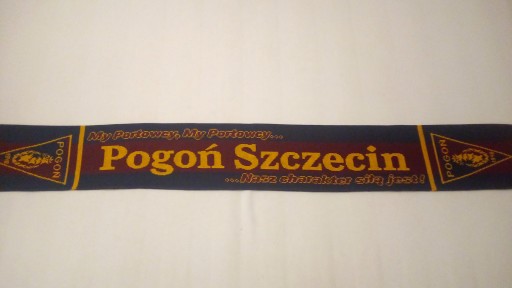 Szal POGOŃ SZCZECIN dziany,dwustronny, na końcach granatowe frędzle.Napis na szaliku--MY PORTOWCY,MY PORTOWCY--POGOŃ SZCZECIN--NASZ CHARAKTER SIŁĄ JEST.